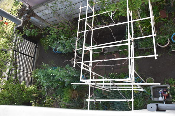 待機中のインゲン ネットの中にもエンドウの後に置く予定の待機中の鉢があります。場所のやりくりが大変です。