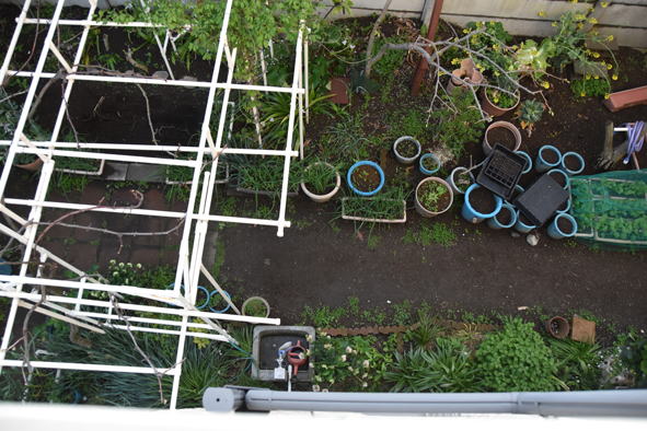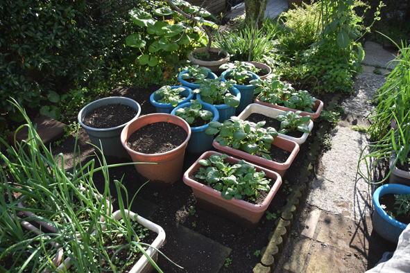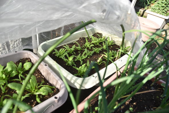 春菊、二十日大根、小松菜、レタスの鉢、小松菜は順次収獲中です。そろそろ次の種蒔きも。