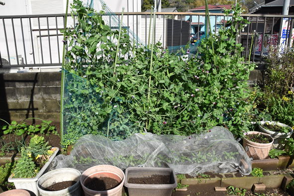 サヤエンドウ、今年は昨年よりだいぶ早い生長です。 小松菜、2回目