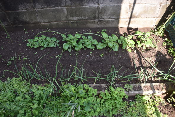 地植えのジャガイモと密植した玉葱 エンドウと手前のネットの中は大根、右端にアスパラガス。