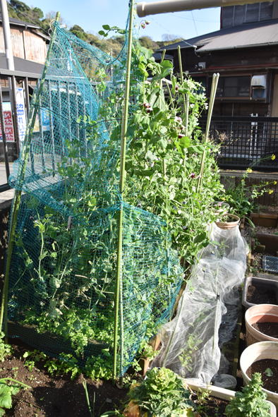 最初に蒔いたレタス 2月に余った種を蒔いたサヤエンドウ、だいぶ実がついて来ました。
