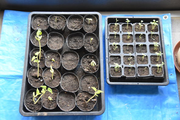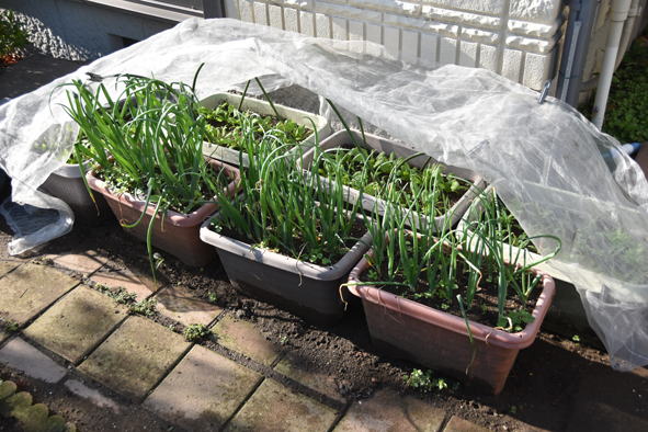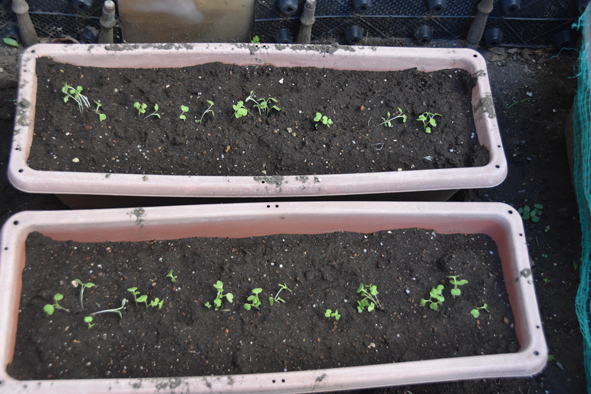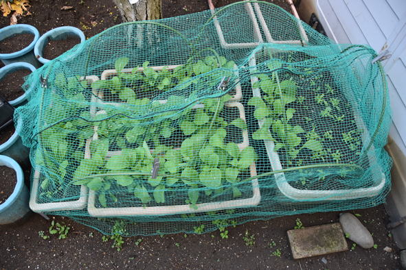 ジャガイモ、芽が出てきています。右側の元気のよいのは買って来た種イモ、左側小さいものは昨年秋に採れたジャガイモから芽が出たもの、こちらは生長が遅く、芽もまだ出てきていないものもあります。秋に採れたものでは直ぐの芽出しが無理なのでしょうかね。右の写真はネットの中で大根が芽を出しています。奥は植え場所がなく余ったニンニクや玉葱の苗を大根の間に植えたもの、日もよくあたらずの場所、鉢植に比べ生長は今一つです。