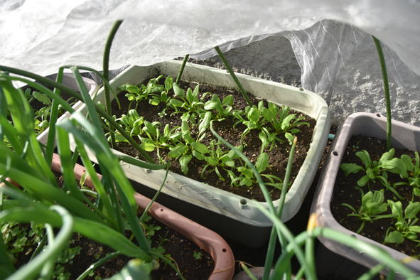 生長中:ニンニク、玉葱、蚕豆、苺、ジャガイモ、小松菜、ホウレンソウ、アスパラガス、大根、春菊、パセリ、アスパラガス、