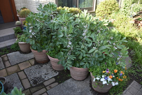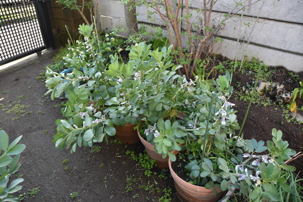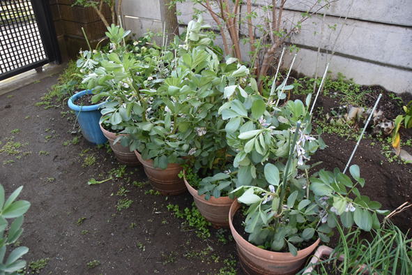 大根とナスは植え付け場所がまだないので鉢で待機中 今年はソラマメ、出来がよくありません。