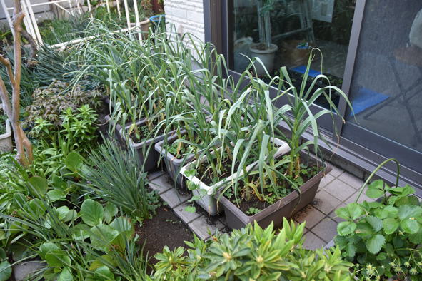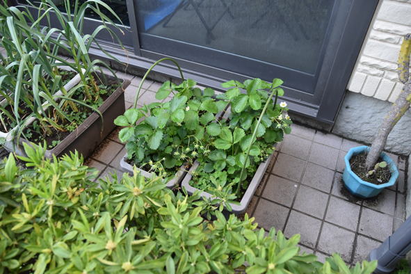 苺、花が咲き始めています。鉢植のニンニクや玉ねぎは順調のようです。