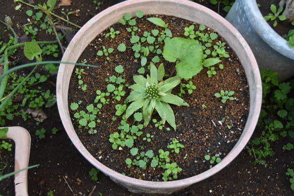 余った玉葱を密植した鉢 蕗を買ってみました。蕗の薹を食べずに花を咲かせた後。