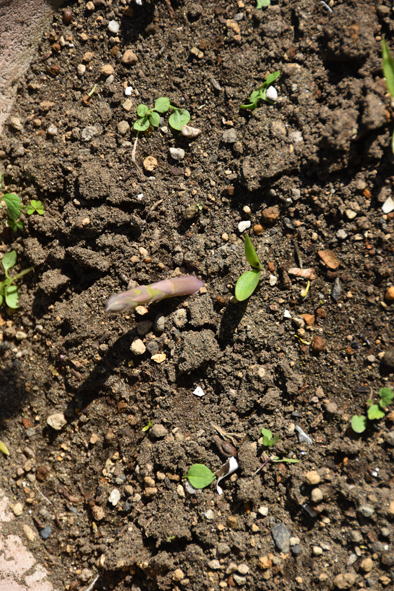 ネットの中は余ったサヤエンドウの種を今年になってから蒔いたもの、少しづつ伸びて来ています。右はアスパラガス。一部芽が大分伸びています。