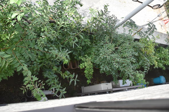 里芋やピーマン、西日の当らない所で育っています。