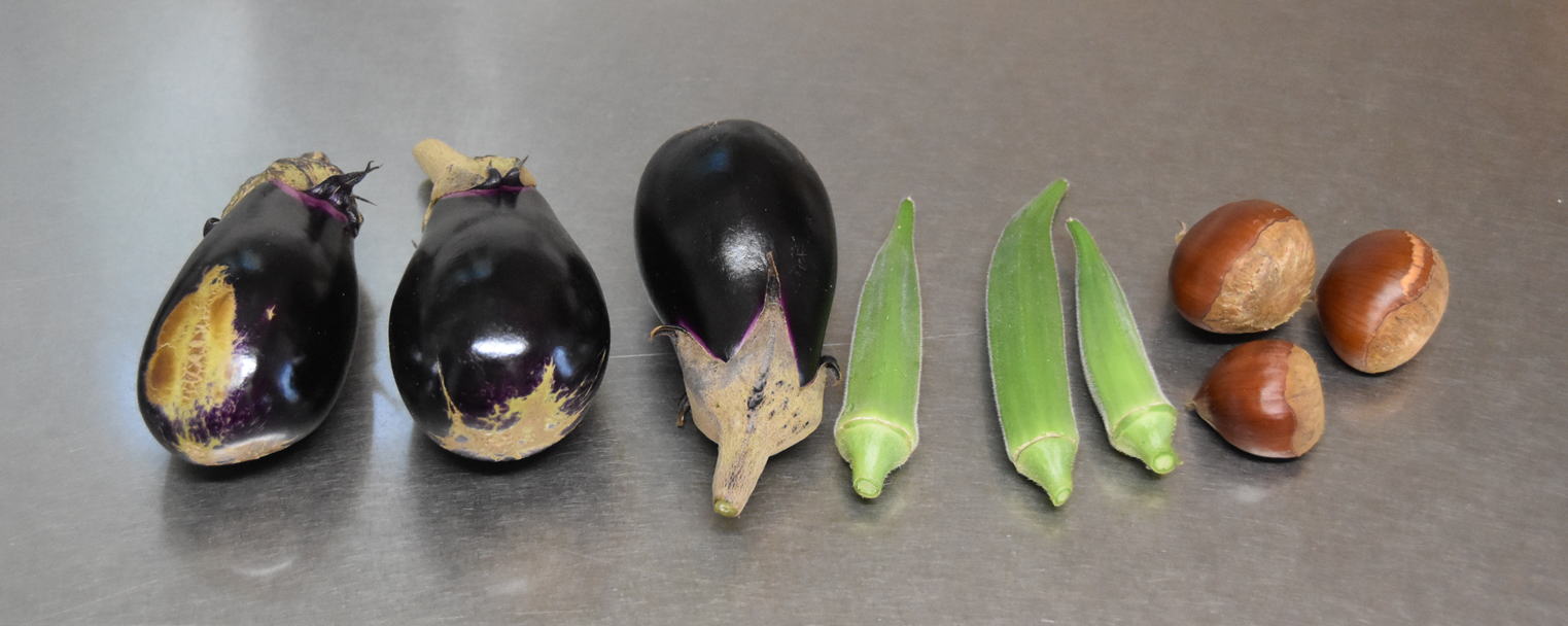 もうおしまいの茄子、栗は実をつけたのが3個、そのうち2個が採れました。昨年は暑さで栗の実はすべて落果しましたが、今年は3個実が育ちました。