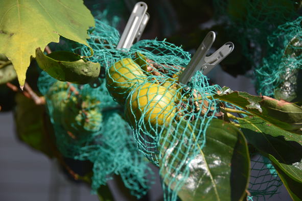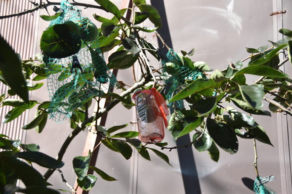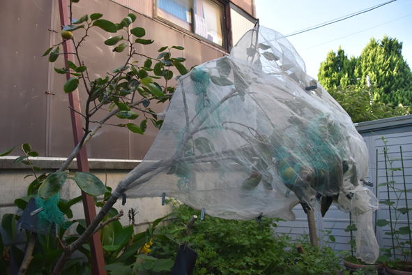 鼠対策、ネットやペットボトルで防いでいます。鼠も青い柿など食べなければならないほど餌がないのかと思っていましたが、青い実を一つ採って食べてみたらほのかな甘みがあり、渋みは全くありませんでした。