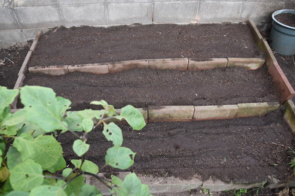 ミニ白菜は植え付けましたが、ほうれん草は植え付け予定場所にまだ茄子が元気に実をつけているためまだ待機中。 玉葱を苗床に蒔く。